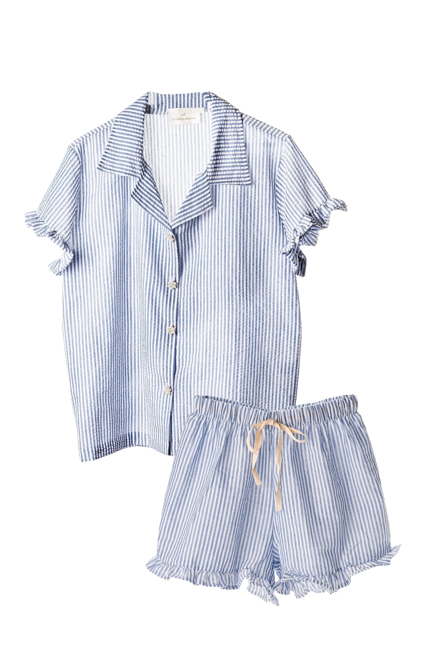 Elevate your style with the Skylar Short Sleeve Set. Made with soft and breathable cotton seersucker, this top offers a comfortable and chic fit. Adorned with delicate pearl flower buttons, it adds a feminine touch. Plus, it's machine washable for easy care. Fashionable and functional.